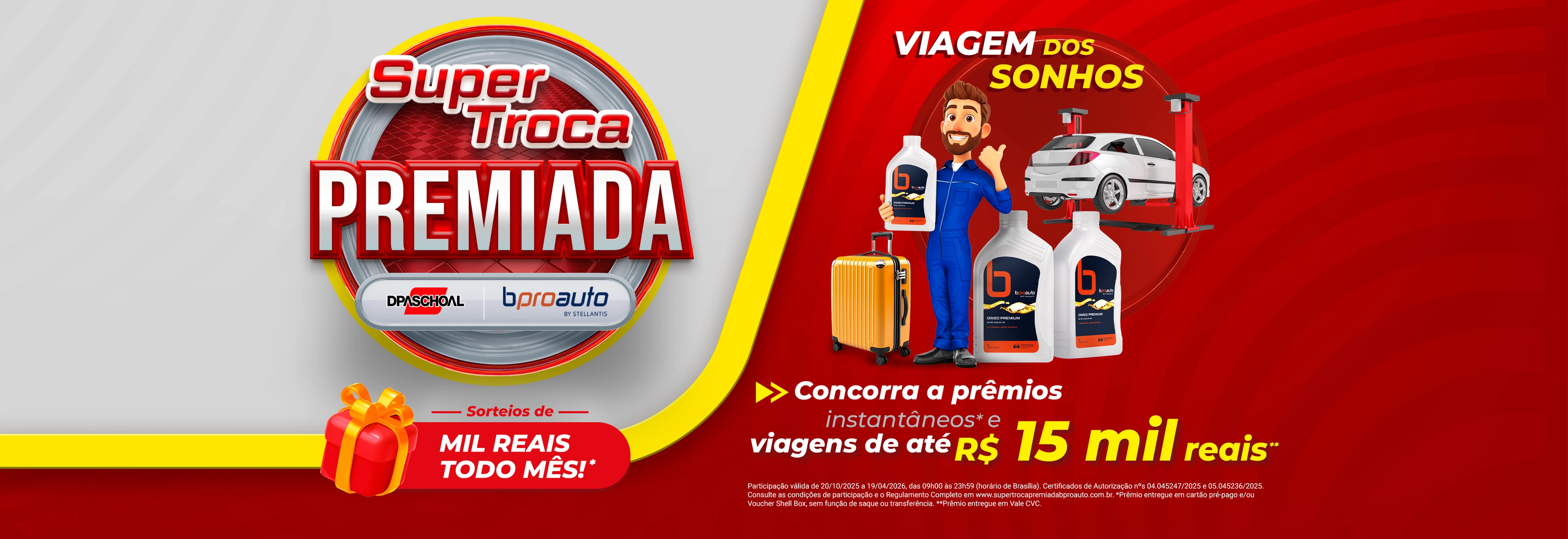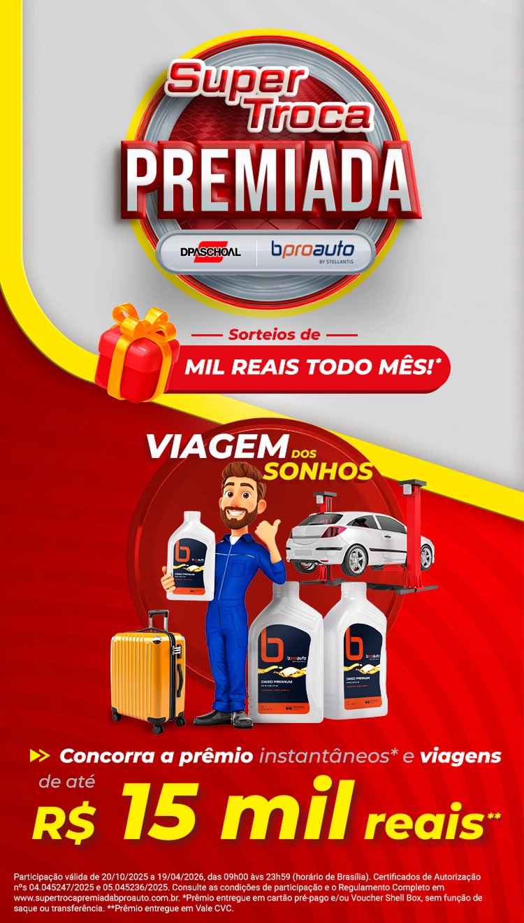Participação válida de 20/10/2025 a 19/04/2026, das 09h00 às 23h59 (horário de Brasília). Certificados de Autorização nºs 04.045247/2025 e 05.045236/2025. Consulte as condições de participação e o Regulamento Completo em www.supertrocapremiadabproauto.com.br. *Prêmio entregue em cartão pré-pago e/ou Voucher Shell Box, sem função de saque ou transferência. **Prêmio entregue em Vale CVC.